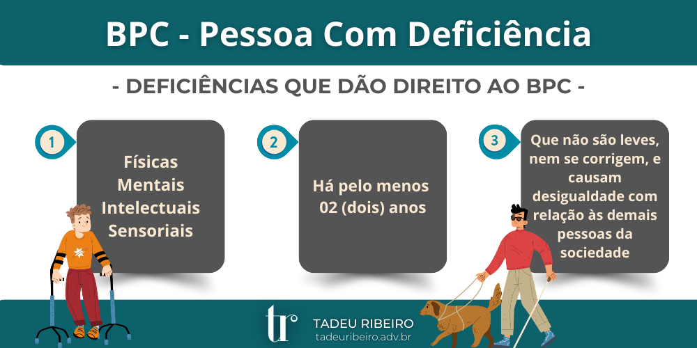 Para ter direito ao BPC Pessoa Com Deficiência, uma das modalidades do BPC (Benefício de Prestação Continuada), é necessário atender ao critério de renda familiar e comprovar a existência de deficiência que, a longo prazo, possa limitar a participação plena e efetiva do requerente na sociedade em igualdade de condições com as demais pessoas. A deficiência pode ser física, mental, intelectual ou sensorial e deve estar presente na vida do requerente há pelo menos 02 (dois) anos, conforme o art. 20, §§ 2º e 10º da Lei 8.742/93 (LOAS).